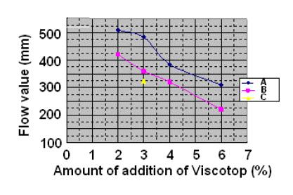 Figure 3(a), (b) shows the relationship between the flow value and the amount of Viscotop added, where samples D and C except C-2 could not measure the flow values one month after mixture. Compared with these figures, it is clear that the fluidity of samples A and B is increased after mixture. Also, the fluidity of sample C with 3% of Viscotop being added was kept.