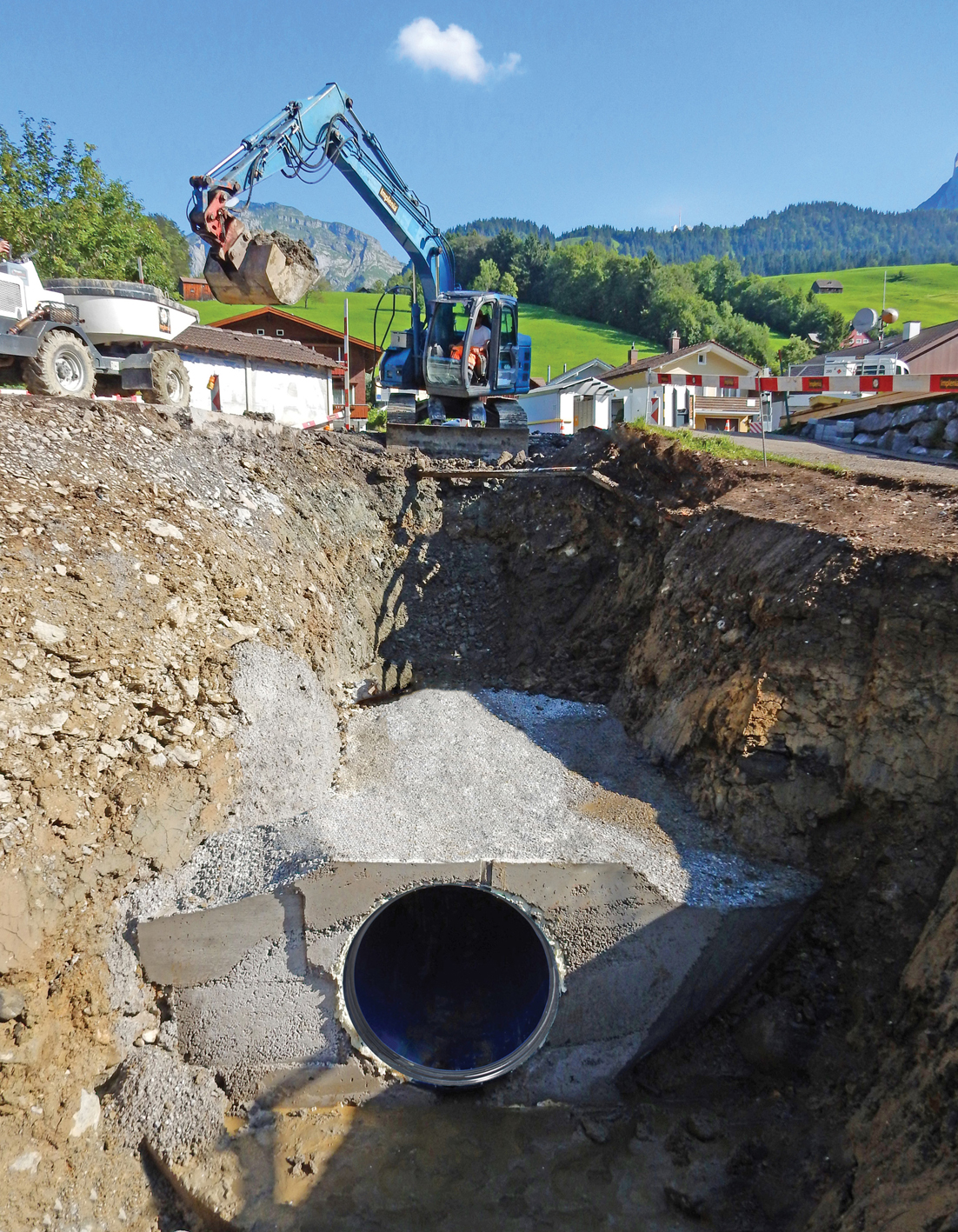 Apart from the thickness of the inner protection layer, the wall structure of the centrifugally cast (CC) GRP pipe can also be customized for special project conditions. Comprehensive examinations in the internationally recognized HOBAS TechCenter in Austria confirmed the pipes’ unique performance in e.g. long-term deflection and strain corrosion test settings. And the top-performing CC-GRP pipes have already proven their worth in real-life applications: In Switzerland, they help to safely transport storm water containing sharp-edged stones and debris.