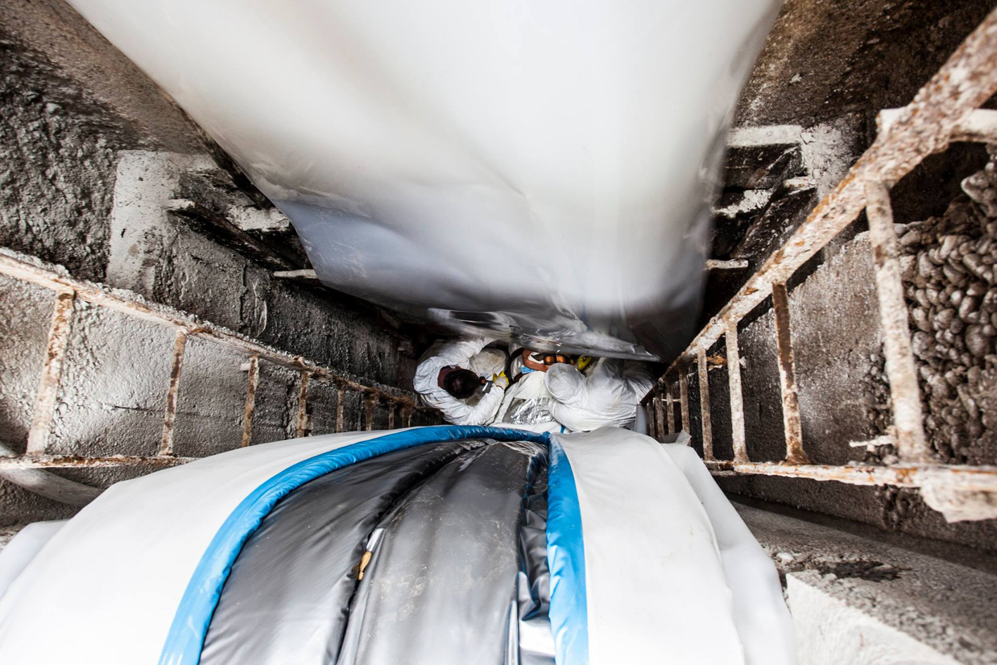 To ensure that no-one sank into mud in front of the shaft, teams from Brandenburger and AKWA heaped up minerals at the entrance on the first day of construction. The next steps were to smooth out sharp edges in the shafts with a power grinder, position the cable winches as well as the conveyor belt and finally draw in the foil over which the liner was to slide into the sewer.