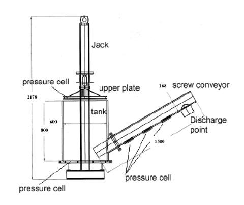 - tank by an inclined screw, was built in Politecnico di Torino (Vinai et al., 2006). The device represent an approximate 1:10 screw conveyor scale model with a screw conveyor lenght/diameter of 9. The device (Figure 2) is made of a 800mm high tank with a 600mm nominal diameter which is filled with ground. An alluminium plate connected to a hydraulic jack, with a stroke of 500mm, applies a nominal pressure to the tank (up to 2MPa). A 1500 mm long screw conveyor is coupled to the tank with an upward inclination of 30° and the screw extends inside the tank to collect and extract the soil. The diameter of the screw case is 168 mm, the flights have a pitch of 100 mm.