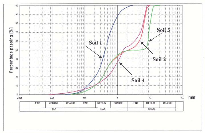 - soil 4: a mix with 45% of sand, 45 % gravel 4-8 mm, 10% of silt, with D10 = 0,2 mm and D60 = 3,5 mm