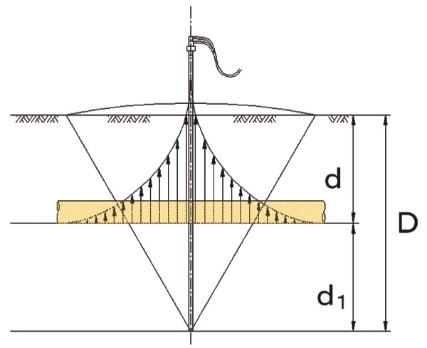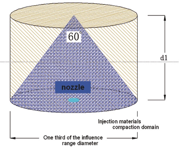 It is assumed that the effect of the pulse injection is defined as a cone, the centre of which is defined as the outflow point of the injection hole. The height and width of the cone are the distance from the centre to the real arrival points of the grouting material, as shown in Figure 10. It is supposed that the injection pressure of the grouting is acting within the range of the cone as mentioned above. For example, if the upheaval is measured 0.15 MPa at an injection depth of 10 metres and the radius of the cone is 10 metres, the vertical angle is 60 degrees. If the upheaval pressure is defined as the pressure required project from the pipeline, the injection depth is determined as follows.