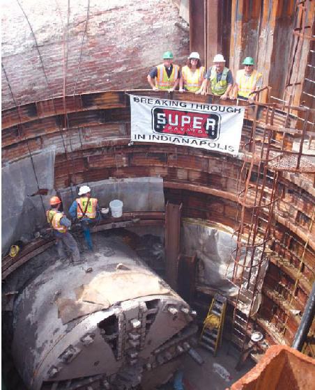 The mining in Indianapolis was started in early of December 2005. Ground conditions consisted of man-made fill composed of clays and mixed sands, as well as cohesive glacial till deposits, interbedded with sand and gravel outwash. Operating at pressure up to 4 bar (58psi), the first drive of 200 meters (620Ft) was finished by 22nd of March 2006. The second drive was launched at 21st of April and 310 meters (1,020Ft) distance was covered by the 15th of August 2006. The total length of the tunnel made was 510 meters (1,640Ft). The TBM installed a pre-fabricated 6-piece reinforced concrete segment lining. Each ring typically took 20 minutes to be installed. The best production achieved - 9 No. rings during a 10 hour shift.