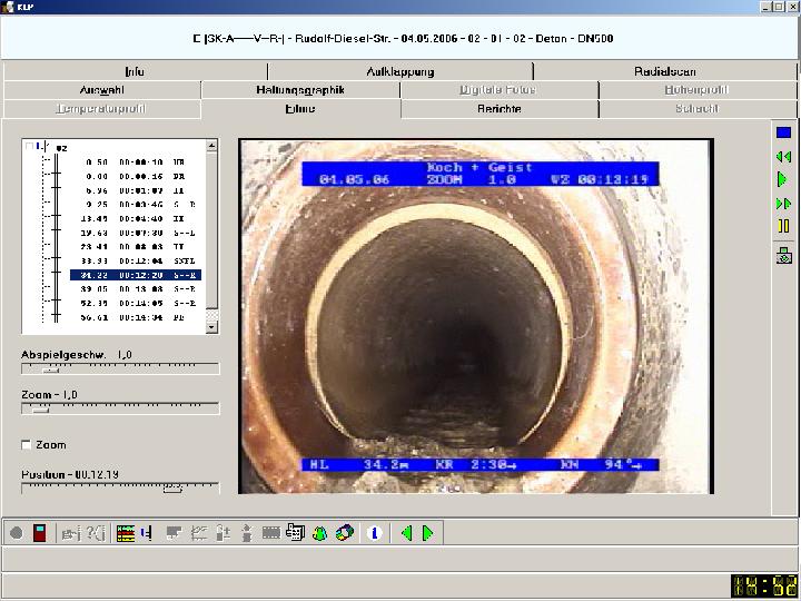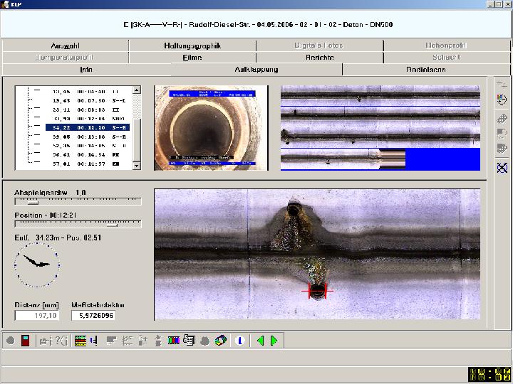 The network operator and/or the client usually receives these pictures as a file on a CD-ROM and they are visualized by the "KEP viewer". Additionally, it contains other information such as basic and master data of the inspected sewer section as well operating functions.