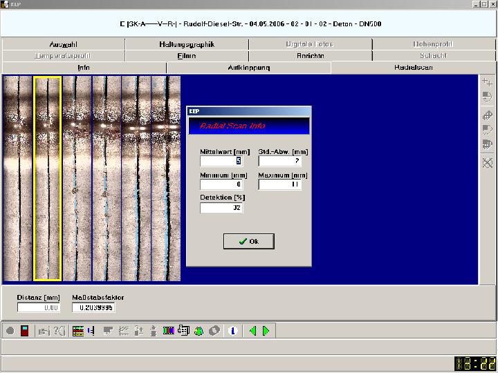 The system is completed by the automatic swivelling of pipe joints by the 10x zoom lens that rotates around the own axis by 360°. Besides a fold-out in the BMP-format, on which distance and area measurements are possible by mouse click, the automatic image recognition ("socket mosaicing"), which is connected to the so-called "socket radial scan", creates so-called socket statistics, which provide important information on the width of the socket gap and possibly its development ("socket gap history") (Fig. 5).