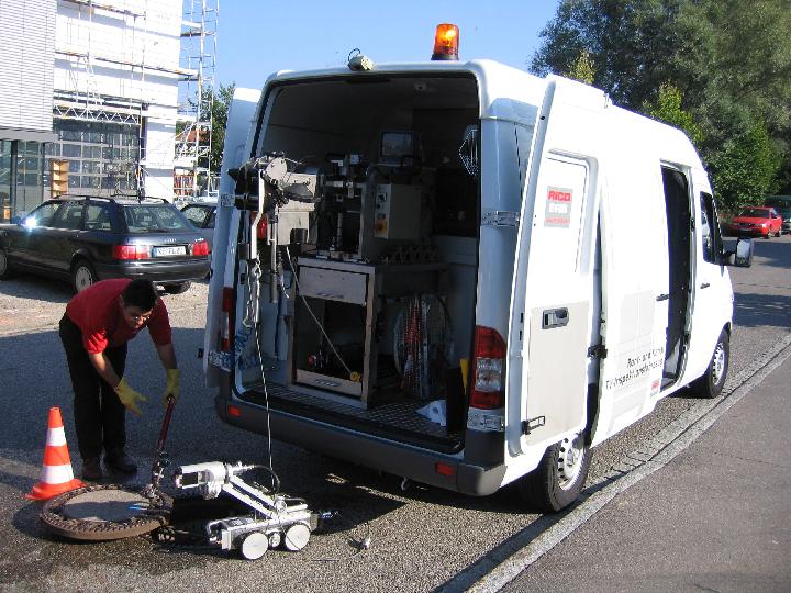 On 8 September 2005 in-situ inspections were performed in a residential/industrial street situated in the city of Kempten/Allgaeu. Here, by means of a hybrid camera that was installed inside an inspection vehicle for demonstrative purpose (Fig. 6) a vitrified clay sewer DN/ID 500 mm with a section length of 58.77 m as well as a concrete sewer DN/ID 600 mm with a section length of 59.70 m were inspected. A repeated accessing for testing purposes of a concrete sewer DN/ID 500 mm with a section length of 57.01 m was carried out in Münster, Germany by the contractor Koch + Geist GmbH on 4 May 2006. This had additionally become necessary to particularly test this function once again after RICO had eliminated an error in the automatic socket gap measurement "socket radial scan", which had been discovered by S &P.