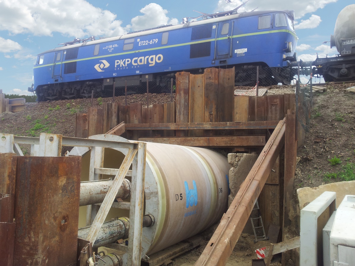 HOBAS Poland supplied the required pipes with an external diameter of 3000 mm for the realization of the culverts. The pipes’ smooth inner surface ensures that flood water which flows through them and usually contains various impurities does not lead to siltation. HOBAS Pipes also made it much easier to resume jacking works after an installation interruption due to heavy rain: The water causes the sandy soil to become slightly compacted and adhesive, and the thrust force required to restart works after the interruption is usually quite high. Thanks to the smooth outer surface, the necessary forces would be comparably lower and a restart quite easy. Before the start of the jacking works, the rail tracks were equipped with special beams that transferred the load from the trains evenly to the rails in case of any ground movements.
