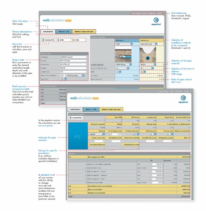The new Web Calculator finally provides transparency when selecting procedures for laying plastic pipelines. For the first time a program reveals within seconds which of two procedures is the most cost-effective and, like a compass, indicates the right direction for economic pipe installation. This tool has been developed by egeplast and provides those responsible for projects with a quick overview with detailed comparison of costs.