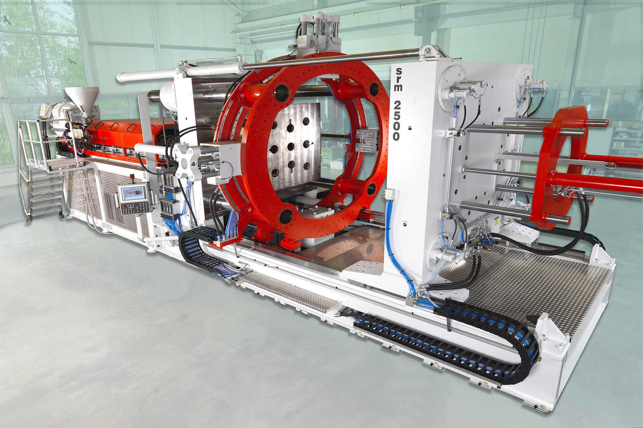 The plasticization and injection system is suitable for processing a wide range of materials from virgin through regrind to recycled plastic. If the material still contains particulate impurities, a melt filter – such as a high performance filter in the Ettlinger ERF series – can be installed in-line between the extruder and the accumulator of the injection unit without any complications. Longstanding experience with the srm series has shown over and over that the mold technology also benefits from the lower clamping force.