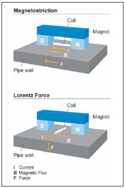 Electro-Magnetic Acoustic Transducer technology is based on electro-mechanical conversion produced when an eddy current is applied within a static magnetic field. The resulting Lorentz forces and magnetostriction result in an interaction between the EMAT and the metal surface generating an acoustic wave within the material (Figure 2). The material being inspected is its own transducer, eliminating the need for liquid couplant. The acoustic wave that propagates within the pipe wall is dependent on the dimensions and properties of the pipe material. Therefore, the presence of SCC and other crack features will disturb the guided-wave in such a way as to produce a reflection resulting in an echo. This echo can be detected and measured.