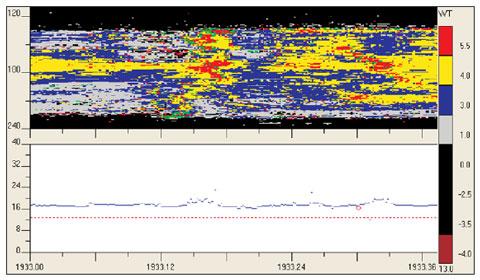 The B-Scan of Figure 4 shows the thickness of the coating. The profile is much better visible as in Figure 3. The thickness of the coating varies from zero to about 3.5 mm.