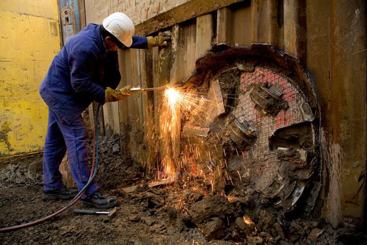 Due to this site configuration, the product pipeline can be installed in one step. The direct installation of the pipeline allows for continuous drill-hole support preventing hole collapse. The DIRECT PIPE ® site configuration also allows for a basic launch and target shaft design. It is only necessary to provide a launch seal and firm foundation for the Pipe Thruster on the launch side in order to transmit the thrust forces to the soil. Upon arrival in the target shaft, only the TBM and the connection pipes have to be disassembled; the installation of the product pipeline in the ground is then already completed. Feed and slurry lines as well as control, data and power cables are led through the pipeline on special roller assemblies; they can be easily removed from the pipeline using a rope winch.