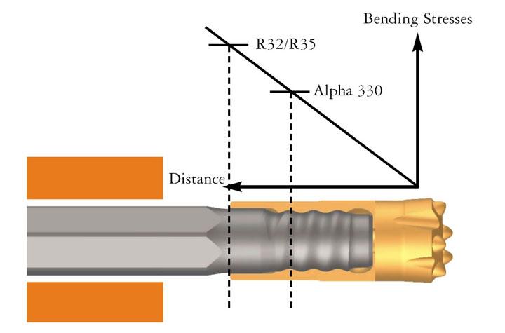The Alpha 330 system benefits further from the inherently stronger and more rigid R33 thread. Although only 1 millimetre larger in diameter, R33 has a 14 per cent larger cross-section than R32 and is therefore proportionately stronger, even without the benefits of a shorter thread. To improve rigidity still further, Sandvik has introduced a new guiding function between the rod and bit-skirt, immediately behind the thread. The provision of a snug interface at this crucial point at the rear of the connection greatly improves the rigidity of the joint. After the bit skirt, the rod cross-section increases to Hex-35 quickly and smoothly, without the typical gooseneck that is so vulnerable to bending, as well as to sandblasting by the drill cuttings. What is more, since the bit skirt covers the thread completely in the Alpha 330 connection, no part of the thread itself is exposed to sandblasting either. This reduces the risk of corrosion-fatigue, a common menace in rock drilling tools.