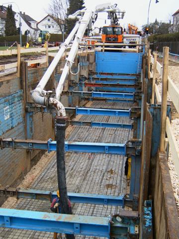 Linear Shoring also reveals its strengths in the handling sector. The elements of the shoring system can be quickly and easily manipulated during installation and removal. What’s more, it was also possible to feed the 3.75 m, 3.4 m tall and 3 m long precast concrete elements without difficulty under the shoring. Beforehand, a 20 cm thick concrete base slab was poured as the bed for the pipe.