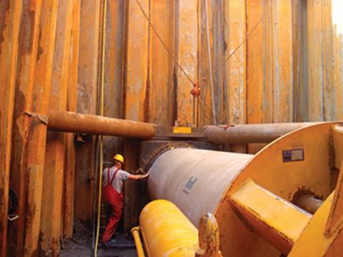 The three other microtunneling sections were implemented with in this field unique CC-GRP pressure jacking pipes PN 6 and flush FWC couplings. These run beneath a gas pipeline, a main road, several streets and a navigable channel where the installation was conducted in 12 m depth. A 275 m long section with CC-GRP pressure jacking pipes of 1280 mm outer diameter was jacked in a curve radius of 1300 m. The contractor decided to install an intermediate station which according to safety standards is required for jacking with over 4000 kN. Due to the smooth and non-absorbing outer surface of HOBAS Pipes their light weight and constant outer diameter, the maximal jacking force did not exceed 1800 kN. The intermediate station was therefore never in operation.