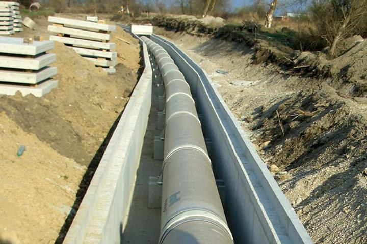 The third and ultimate section of the line leads from New Zagreb to the Homeland Bridge. This 3 km long section runs through a water protection area with Zagreb's springs so that the high quality pipes needed to be placed into a watertight concrete channel. Concrete supports hold the line every 5.8 m where it is fixed with stainless steel straps. An 8 mm thin EPDM layer was applied between support, strap and pipe to allow small longitudinal movement due to temperature variations and to evenly distribute the pipe weight on the supporting areas.
