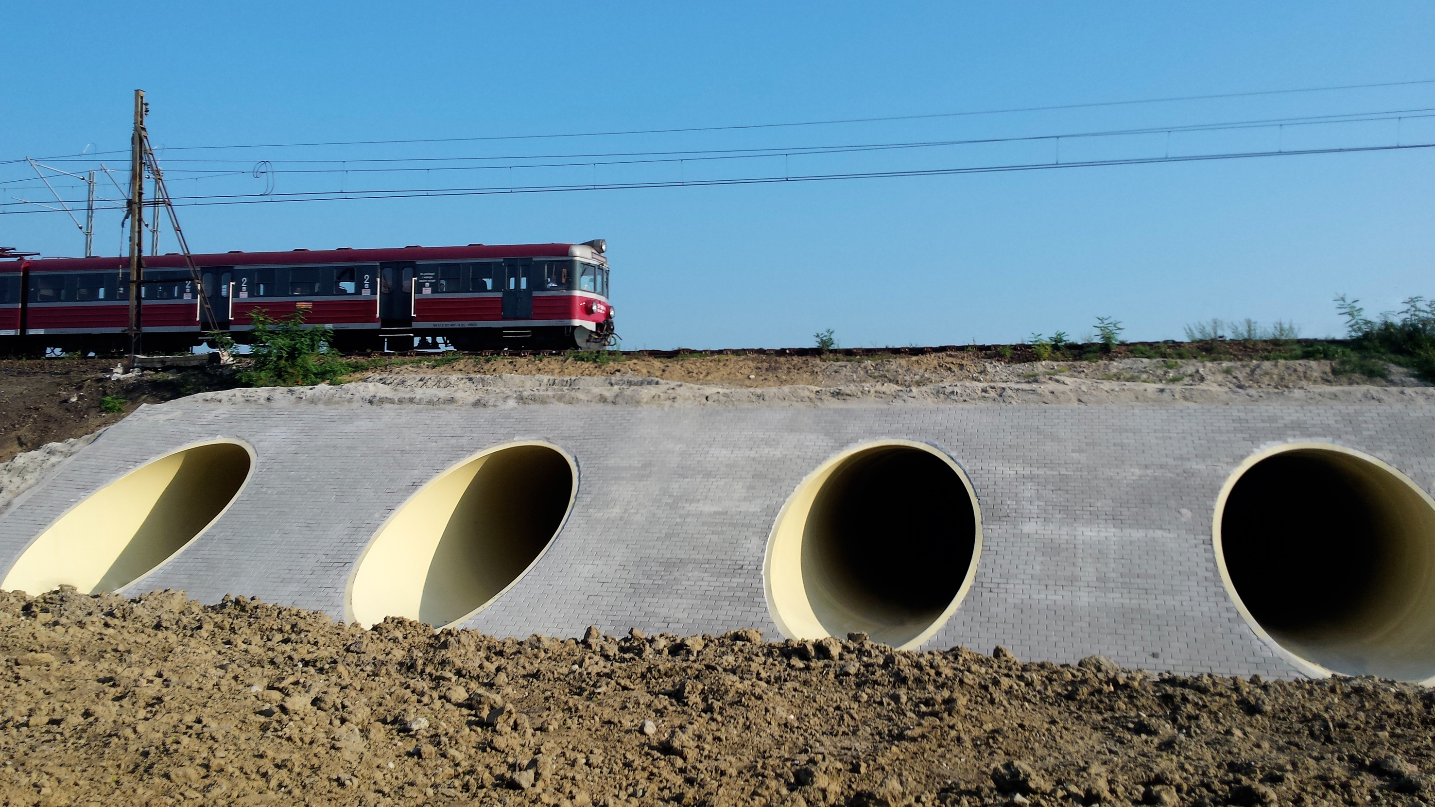 HOBAS Poland supplied the required pipes with an external diameter of 3000 mm for the realization of the culverts. The pipes’ smooth inner surface ensures that flood water which flows through them and usually contains various impurities does not lead to siltation. HOBAS Pipes also made it much easier to resume jacking works after an installation interruption due to heavy rain: The water causes the sandy soil to become slightly compacted and adhesive, and the thrust force required to restart works after the interruption is usually quite high. Thanks to the smooth outer surface, the necessary forces would be comparably lower and a restart quite easy. Before the start of the jacking works, the rail tracks were equipped with special beams that transferred the load from the trains evenly to the rails in case of any ground movements.