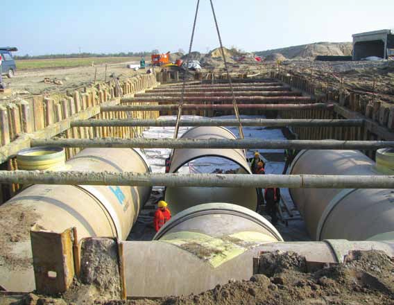 A total of 9 tanks with a capacity of 266 to 854 m3 each were delivered. The storage tanks size was chosen to match the expected water volume including also a possible surcharge of 10% and some extra volume for emergency situations. They comprise 2 to 3 pipes DN 3000, 13 to 62 meters in length. The delivery also included insection manholes.