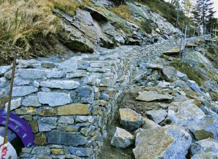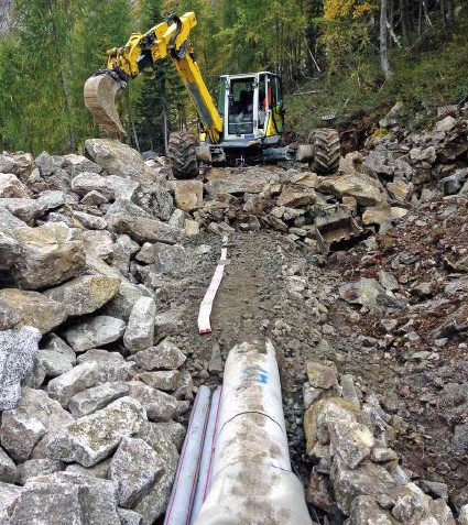 Over the entire 3,200 m length of the pipeline route, with a height difference of just about 1,000 m, there were various and challenging installation situations to be mastered in mountainous terrain with stony, rocky ground. In order to preserve the natural appearance of the environment as far as possible, the pressure pipeline was installed underground along almost its entire length, with one exception: the pipeline crosses a stream aboveground via a pipe bridge. The almost natural reconstruction of the route was done with excavation material and natural rocks and boulders (Figures 7 and 8).