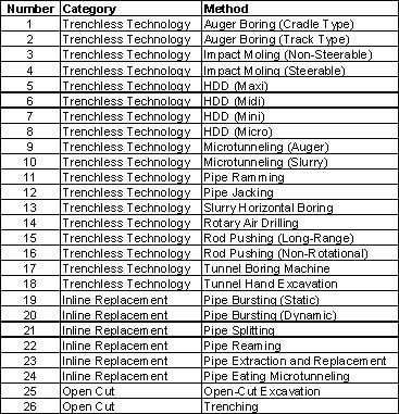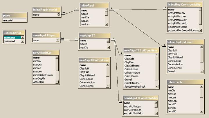 The relational method databases contain a plethora of information about each method. The databases contain general information about each method, which includes a detailed method description, a color picture and the methods expected environmental impact and extent of excavation. The databases also contain information about the method's technical capabilities, which includes the maximum and minimum pipe diameters, the maximum and minimum drive lengths, and the maximum and minimum allowable depths of cover. The databases also contain pipe compatibility information for ten commonly used pipes as well as soil compatibility information for ten types of soil as well as ground water table limitations. A schema showing the relationships among the relational tables in the databases are shown in Figure 1.