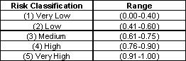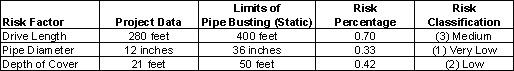 After the technical evaluation stage, the methods that were deemed technically suitable for the project are then reevaluated for the relative level of risk associated with four different categories of risk. The first category is the installation parameters: drive length, pipe diameter, and depth of cover. In this category the project specific values are compared to the limits of each of the remaining construction methods. This comparison results in a percentage which is then assigned a risk level based on the percentage ranges shown in Table 2.