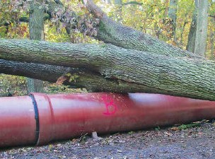 During the latest storm in October 2017, dozens of trees were uprooted in Jungfernheide Forest and a decades-old oak fell onto the interim pipeline. But this did not cause any interruptions to the operator’s services. Once the oak had been removed from the pipeline then, as expected, it was seen that the pipeline in robust ductile cast iron had withstood the powerful impact of the tree without damage. There were not even any detectable alterations to the surface of the pipe.