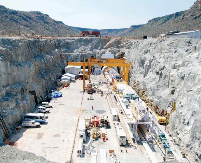 The second Robbins machine will be assembled onsite later in 2008 and launched from the opposite end, at the inlet portal. After excavation of the entire tunnel is completed, a drill and blasted disassembly chamber will be used for removal of each TBM and back-up. The chamber will include poured concrete inverts and installed 170-metric-ton (187 U.S. ton) gantry cranes.