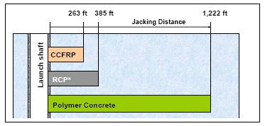 Polymer concrete pipes have one of the highest jacking capacities compared to other pipe jacking materials like RCP, CCFRP, and Clay. There is one material which is stronger, that is steel. But in a sanitary sewer environment it requires either additional coating or the installation of an additional carrier pipe. Clay jacking pipes are used for smaller diameter below 48” and need to be handled with special care due to their point loading sensitiveness.