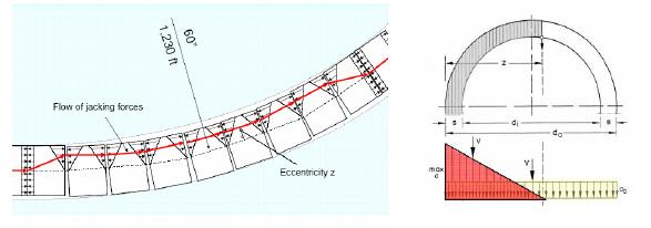 The difference of curved drives compared to straight drives in the design process is the reduction of the maximum jacking load and the calculation of the minimum jacking radius (curve radius plus steering angle of the MTBM).