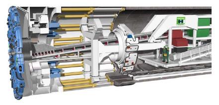 This design was a forerunner of the bolted and gasketed tunnel segment version. The construction took place in kind of ideal ground condition (cohesive soil) with stable tunnel face and no groundwater head pressure. That was the reason why the contractor had chosen an open face machine with a part face excavation by bucket excavator.