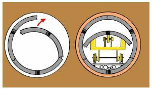 The difference to pipe jacking is that instead of installing the pipes in the starting pit and then pushing pipe by pipe the MTBM forward, the pipe ring is split in segments which are transported through the tunnel to the Tunnel Boring Machine (TBM) ahead of the tunnel and reinstalled there to a complete segment ring in the shelter of the tailskin (rear section of the TBM). The TBM has its own thrust ring, a ring of hydraulic cylinders, with which the TBM is pushing forward, thrusting from the last segment ring installed.