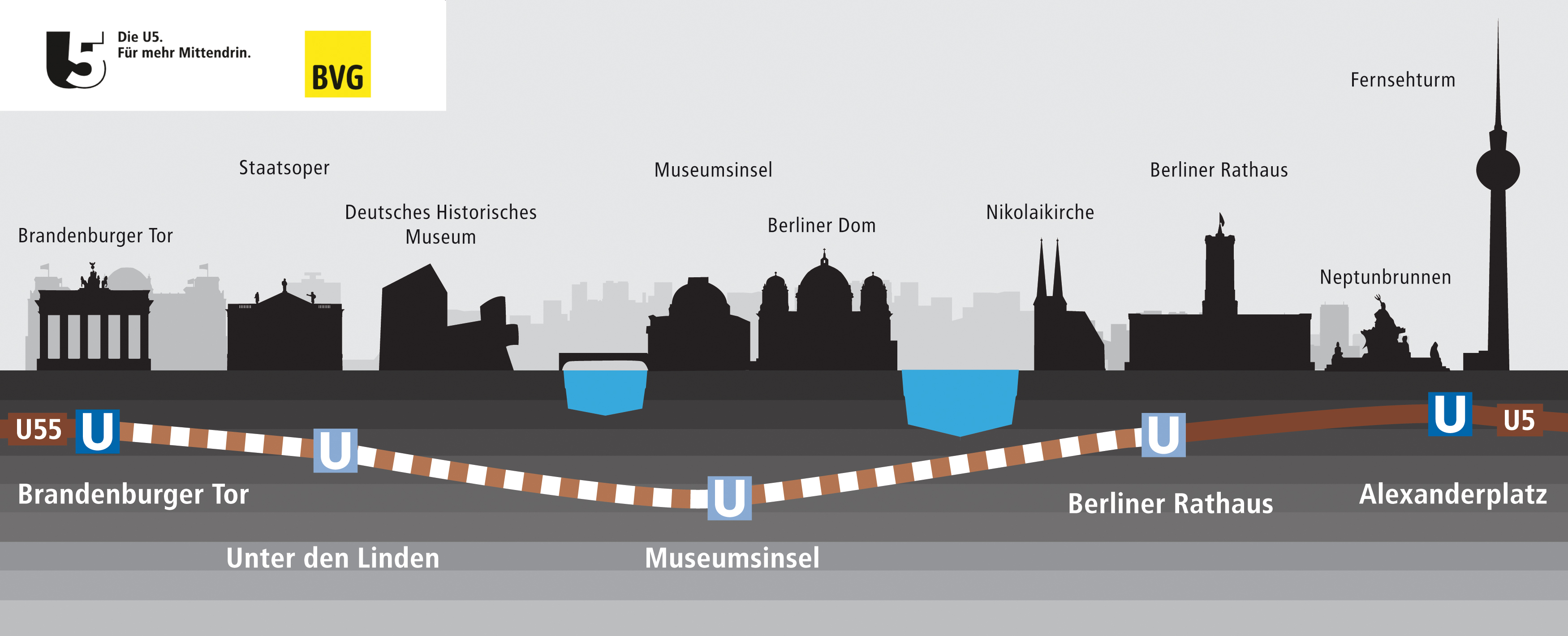 The entire 2.2 kilometer long new line runs from the future subway station Berliner Rathaus past the Rotes Rathaus (Red City Hall), then crosses under the Marx-Engels Forum and the Humboldt Forum as well as the river Spree and the Spree Canal. It then passes under the boulevard Unter den Linden to the metro station Brandenburger Tor at the Brandenburg Gate. Once the new line has been connected with the existing 1.5 kilometer long section of the U55 and the 18.3 kilometer long current U5, from Hönow to the main railway station the new U5 will have a total length of 22 kilometers.