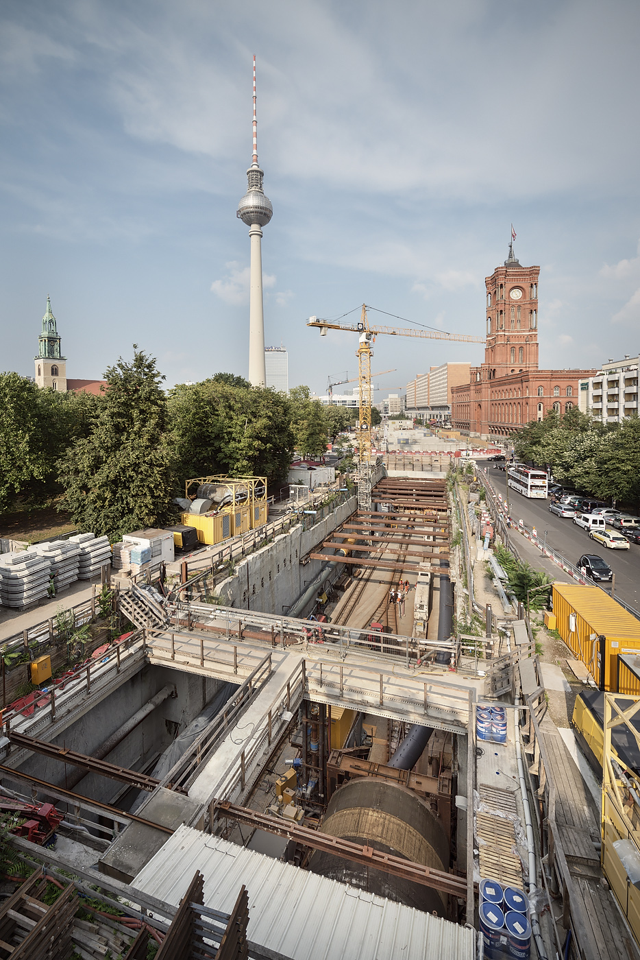 After the start on June 20, 2013 the 74 meter long, 700 tonne Bärlinde tunnelled her way from the launch shaft on Marx-Engels Forum to the Brandenburg Gate. With overburdens of 5 to 17 meters, the machine with a shield diameter of 6.67 meters worked its way under the river Spree, the Spree Canal and Schlossplatz through the two future stations Museumsinsel (Museum Island) and Unter den Linden along the boulevard Unter den Linden. At the same time it built the tunnel shell out of high-quality concrete segments.