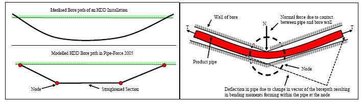4. PREDICTING THE PULL-IN FORCES WITH LONG DISTANCE HDD INSTALLATIONS Pipe-Force 2005 [8] was developed to predict the pull-in forces in HDD applications. Whilst this model is unlikely to predict localised increases in pull-in forces due to problematic ground conditions or stoppages in the installation of the product pipe (as experienced in the field), it is able to predict baseline pull-in forces associated with HDD installations. The model describes a HDD installation as a series of straight sections (as opposed to a series of parabolas). Nodes are introduced where the lines intercept one another (reflecting a change in drilling angle) and Pipe-Force 2005 analyses the tensile force at each of the nodes, see Figure 3. An idealised HDD installation would require only four nodes and three straight sections; the nodes would describe the entry and exit points as well as the two transitional points, where the angle of the bore changes from an acute entry or exit angle (generally considered to be between 6º – 20º from horizontal) to the horizontal section of the drive. Additional nodes may be inserted within the borepath to reflect a more complex borepath, deviations from line and level or collapsed sections of the bore.