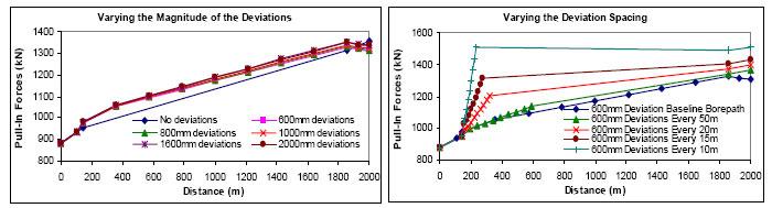 The magnitude of the deviations was varied, using the same spacing as that for the baseline borepath in Figure 5, and the distance between deviations was reduced. It can be seen that varying the spacing between deviations has had the greatest impact on the pull-in force (for a relatively small deviation from line and level); the relative increase in pull-in force at 20m, 15m, 10m and 5m spacings is 1.23, 1.44, 2.16 and 3.96, respectively, when compared to the baseline pull-in force.
