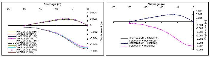 To test the robustness of the model, a parametric study was undertaken to investigate the performance of the simulated tunnelling method for Stages 1 to 3 when changing: the contraction factor, face pressure, soil types and position of the phreatic surface. Where possible the displacements derived were recorded and compared to the values predicted by empirical solutions. Figure 10 illustrates the effects on the displacements induced with the change of contraction factor applied to the newly formed lining as well as the effects of the TBM face pressure on the resultant displacements (Stage 1 results shown only). In both cases the change in the value of the respective parameters results in very little effect on the settlement profile.