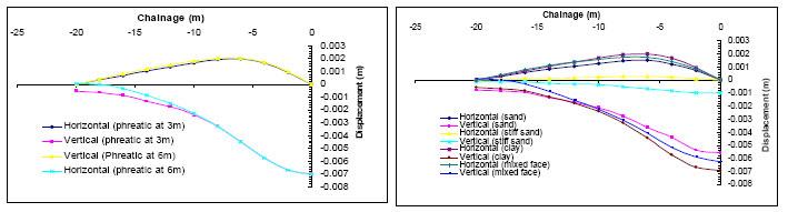 Figure 11 illustrates the effects of changing the level of the phreatic surface (in clay) and soil type for a Stage 1 analysis (N.B. ‘mixed face’ conditions refer to 10m of clay overlying sand). Doubling the depth of the phreatic surface from 3m to 6m has little effect on the maximum displacement yet appears to decrease the overall trough width. Changing the soil type resulted in changes to the displacement profile, e.g. the maximum vertical displacements, at the front plane (Figure 9), were: clay (6.7m), mixed face (6.3mm), sand (5.6mm) and stiff sand (1.0mm).