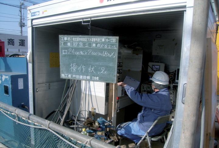 The rectangular pipe jacking machine can be controlled remotely to enable the viewer to review excavation conditions. In addition, the cutting face pressure can be calculated by computer from the cover depth in real-time, facilitating management of the operation. A horizontal clinometer was inserted in the CCP-L upper-centre aperture, and the road surface form management carried out automatic measurement management separately from hand-operated level techniques.