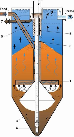 Continuous filtration with DynaSand In the DynaSand filter fouled sand is continuously removed from the filter bed, washed and recycled without interruption to the filtration process. The DynaSand filter is based on the counterflow principle (see diagram). The water to be treated is admitted through the inlet distributor (1) in the lower section of the unit and is cleaned as it flows upward through the sand bed, prior to discharge through the filtrate outlet (2) at the top. The sand containing the entrapped impurities is conveyed from the tapered bottom section of the unit (3), by means of an air-lift pump (4), to the sand washer (5) at the top. Cleaning of the sand commences in the pump itself, in which particles of dirt are separated from the sand grains by the turbulent mixing action. The contaminated sand spills from the pump outlet into the washer labyrinth (6), in which it is washed by a small flow of clean water. The impurities are discharged through the wash water outlet (7), while the grains of clean sand (which are heavier) are retained in the sand bed (8). As a result, the bed is in constant downward motion through the unit. Thus, water purification and sand washing both take place continuously, enabling the filter to remain in service without interruption.