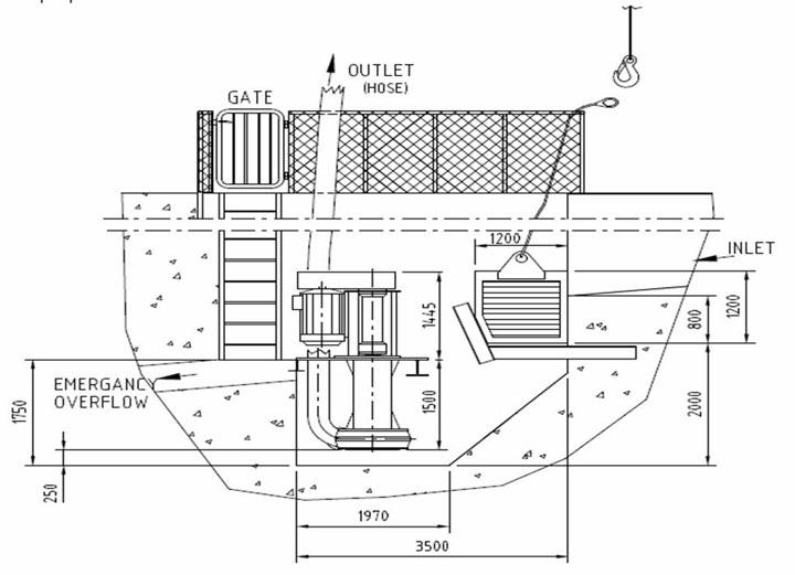 Scale slurry transport with water A pump and sump arrangement at floor level was designed to provide the means to transport the slurry away. Two semi submersible pumps (one for standby) move the water and scale mix. A scrap basket at the inlet traps scale and foreign objects over 2.5 – 5 cm. The sump is designed to avoid build up of walls, it is small with steeply sloping walls with a bottom area about twice the width of the pump house. To resist wear, industrial rubber hoses connect the pump line and the pump, although steel pipes can be used on straight sections.