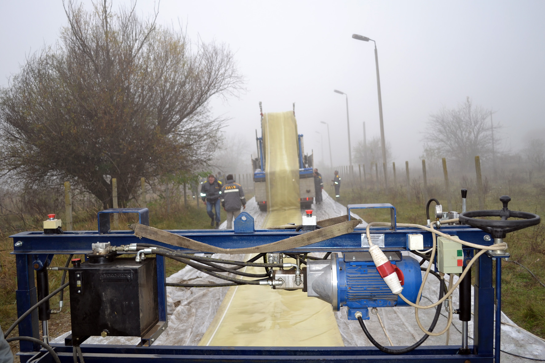Three construction pits provided access to the 328 m long pipe section at a depth of 3 m beneath a field alongside a main road. The installation length of 328 m would normally have been no problem. However, due to the poor bearing capacity of the loamy soil, for weight reasons the liner had to be divided into two lengths of 164 m. The impregnation process took place on a road near the construction site. Long distance was needed for laying out the liner while being impregnated by a mobile impregnation setup and directly wound onto a transport spool. The main and calibration hose were impregnated with the specially designed NORDIPOX D epoxy resin at about 4°C.