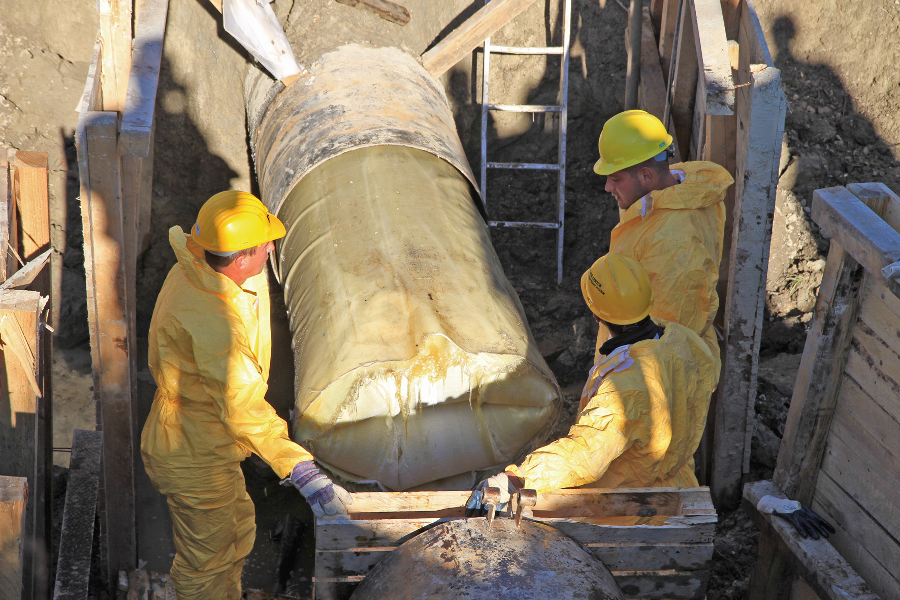 After pipe cleaning, the main hose was gradually drawn into one of the two 164 m long pipe sections by means of a 20 tonne capacity winch. Afterwards, the calibration hose was inverted with low pressure and a speed of 3–5 m/min by means of a pressure drum to position the main hose in the old pipe. The hoses were steam cured at a laminate temperature of 70°C and a new stand-alone pipe was created within a period of two hours. The insulating PE outer coating of the main hose allowed a reduced curing time despite the challenging construction site conditions and the high water level.