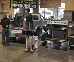 Carter explained, "This Pipe Bursting package allows the contractor to take all of the 'back breaking' activities out of the large diameter pipe bursting projects." He continued, "By adding an automatic cable reeler for cable management and a boom crane to drop the M100 into the pulling pit, TRIC allows the contractor to replace 300 to 600 feet of 8 inch or larger pipe in a day. Carter concluded, "We added high pressure water tanks to the hydraulic pump so you can clean the equipment on the job site, as it comes out of the pulling pit, the equipment goes home as clean as it arrived on the job site."