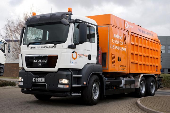Following its three-plus two year supplier agreement with gas distribution company, Wales & West Utilities, signed in 2008, MAN has delivered two new MAN TGS 26.440 6x2-4 BL chassis with ground-breaking suction excavation equipment from TT-UK and German design partner RSP. These are the first two vehicles of their kind purchased by WWU and are used for below ground gas-pipe maintenance and replacement work. Surrounding ground, including broken concrete, is sucked up and deposited in a chassis mounted container.
