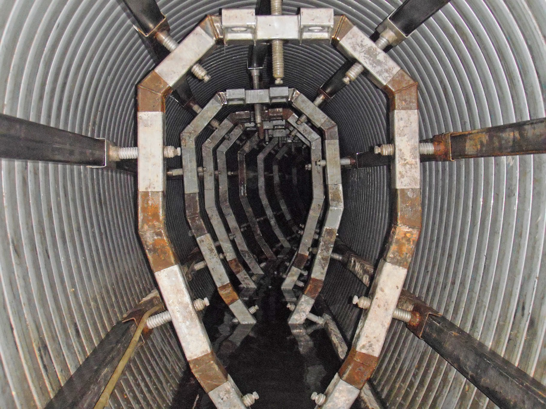 After the Spiral-Wound liner was completed, a bracing system was installed so that the annular space could be filled. The bracing frames positioned the Spiral-Wound pipe liner according to the static requirements and thus prevented buoyancy, a positional deviation and deformation during the subsequent grouting. The annular space was sealed after each 80-metre section of installation length and filled up in layers with special grout to re-establish the static features of each section.