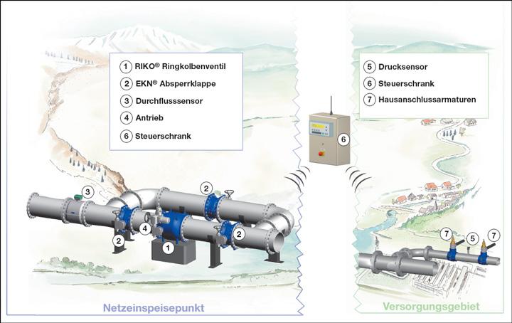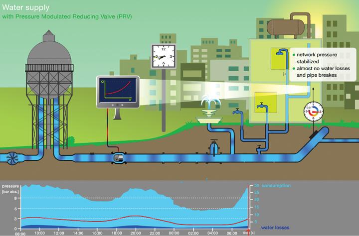 A control device (Plunger Valve) and a pressure sensor together with a flow meter are installed at the supply area's feed point. A programmable logic controller (PLC) records, processes and archives the measured sensor data that are needed to control the Plunger Valve. Depending on the supply system's topography and consumption, the valve is moved into the position that optimally reduces the supply pressure. Reducing the supply pressure reduces the amount of lost water. Positive side effect: Reducing the supply pressure reduces the risk of new leaks occurring in the supply system.