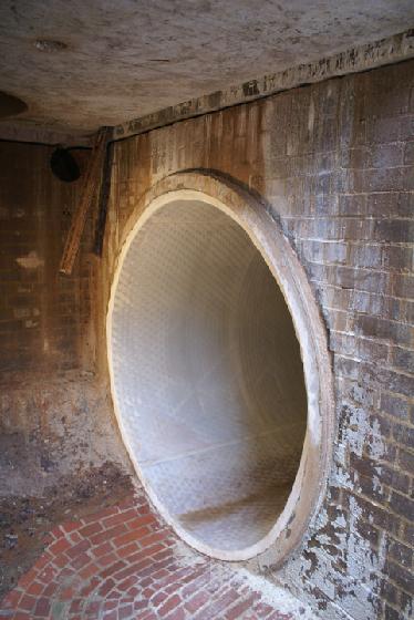 The liner insertion occurred with a 5-ton pulling winch. A diversion roller, fixed right above the insertion manhole, allowed feeding the HDPE-liners into the host pipe one-after-the-other (Figure 3). As required by the design calculations, one Preliner and two studded HDPE-liners had to be inserted. Following the liner insertion, a tailor made sealing plug was introduced from one end into the "liner-sandwich" to apply air-pressure through the plug’s core. This procedure is necessary to unfold the liner over its whole length and give the system a provisional circular shape. Once in circular shape and after some further working steps, inflatable sealing plugs could be inserted from both liner ends to apply the final counter pressure for the grouting process. Thick timbers were used to construct a rigid bracing, which - with a liner of 2m in diameter and an 8m pressure column respectively 800 milibars - had to resist an equivalent horizontal force of approx. 25 tons.