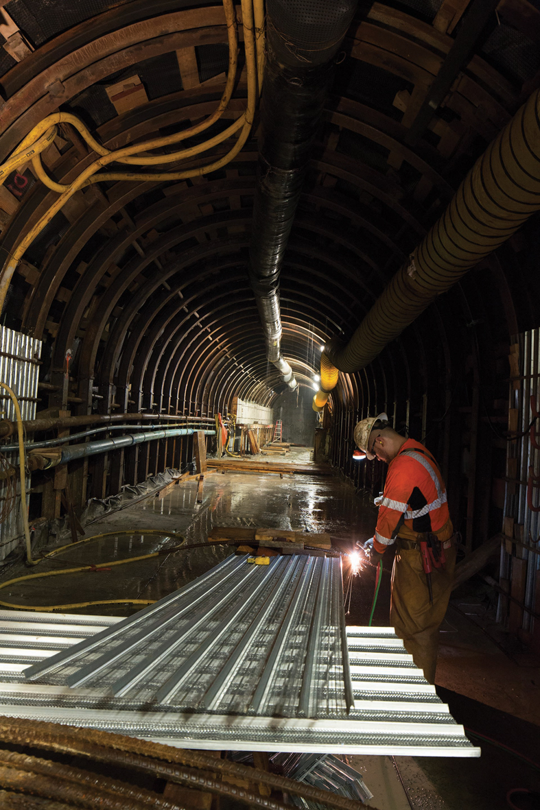 The curve is not the only unusual aspect of the tunnel; in fact, a tunnel on this scale has not been built in the Hawaiian Islands before. Everything from the logistics of the tunnel operation to pre-grouting sections ahead of the TBM for groundwater control are new to the Aloha State. Director of Southland, Tim Winn, elaborates: “There has not been a Tunnel Boring Machine of this size in the Hawaiian Islands or a tunnel of this length. The tunnel is being driven from an active Water Treatment Plant (WTP), and space is at a premium. There are also simultaneous contracts being performed there outside the scope of our work.” He adds that although there have been challenges, teamwork has been key: “Robbins Field Service has been extremely valuable during assembly and commissioning of the TBM.” As of June 2015, the TBM has excavated more than 300 m (1,000 ft), and is boring at a rate of 12 to 15 m (40 to 50 ft) per day in basalt rock. Rock bolts, steel arches, wire mesh, and ring beams are being installed as necessary.