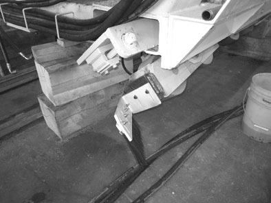 Since the rails were not in place ahead of deck 1, the front wheels had to run directly on the PVC tunnel lining. Due to the delicate nature of the PVC inner lining and its critical importance, great care had to be taken to prevent damage during installation, or by contact with the backup. Except for the bottom drainage, the PVC lining had to be 100% sealed so any damage had to be fully repaired. Ultimately, the lining was 100% spark tested so quality assurance of welding and prevention of damage was a must. Since some of the backup wheels rolled directly on the lining, the acceptable contact load had to be determined for the particular wheel type used. Traylor Shea JV performed loading testing of elastomeric wheels on the Ameron T-lock sheets to determine loading limits and prevent damage. The testing was carried out on site using 60 durometer urethane wheels left over from previous projects. The wheels were tested by pressing the wheel into the PVC sheet, which was then held for up to 24 hour increments using hydraulic cylinders to apply varying loading. The testing resulted in a contact pressure of 1,000 psi, or about 6,000 pounds of force per wheel. Once the critical loading pressure was determined, a series of tests were performed to determine any damage caused by movement of the wheels under the high pressures, namely rolling damage and damage caused by embedded grit from a dirty liner. Traylor Shea determined that the sideways loading on the wheel edges did not damage the PVC liner. However, dirt and debris on the PVC sheet caused very serious damage to the liner as the loaded wheel pressed the grit into the sheet. This caused enough damage to result in a failed spark test. Once this analysis was performed and the results realized, a cleaning system in front of the urethane gantry wheels was deemed to be necessary. TSJV recommended that brushes or air puffers be used to push any such material out of the path of the wheels. Brushes were ultimately supplied. Throughout the tunnel drive the brushes provided adequate cleaning capability to prevent debris from become embedded in the liner (see Figure 12).