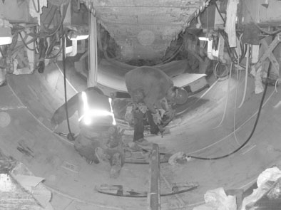 As the mining progressed, Traylor Shea JV made numerous improvements to the welding process that maximized efficiency, including staging various laborers at each workstation during mining and staging materials in critical areas within easy reach. The Resident Engineer’s tunnel inspection team provided oversight of the process as well as proof testing of the welds using rounded-edge putty knives. Traylor Shea provided testing checks of the welds using Tinker Rasor spark testing devices. Final testing and repairs remained to be completed at the time of this writing (see Figure 4).